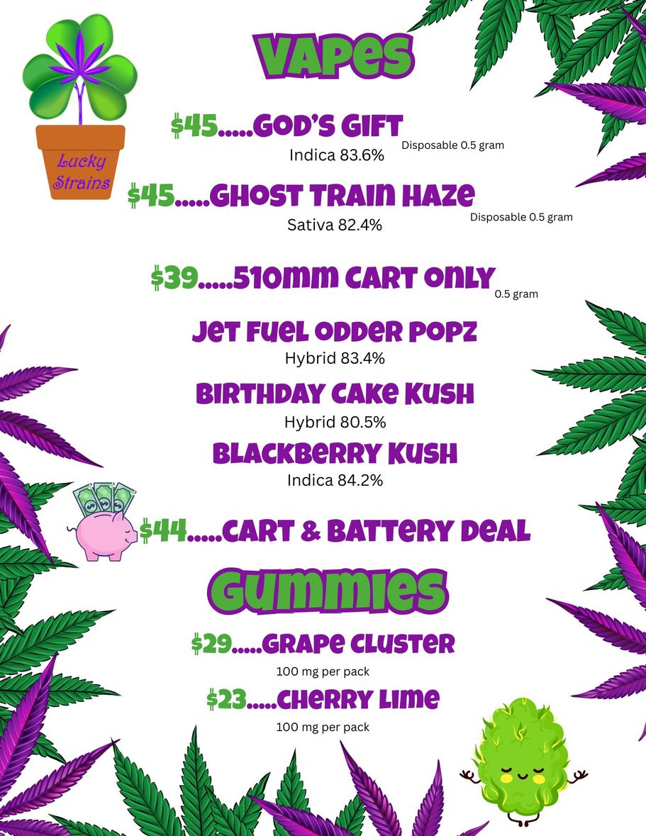Cannabis Vapes and Gummies are available. We are SOLD OUT of Flower for now. Tap the Shop Lucky Strains button for the online menu. Then make your way to our store in New Brighton on Silver Lake Rd.